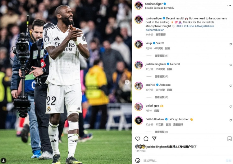 賽后呂迪格也在個(gè)人社媒曬出本場(chǎng)照片,配文寫道:“不錯(cuò)的結(jié)果,但是下一回合我們要拿出自己最佳的狀態(tài),感謝球迷們今夜難以置信的支持!”