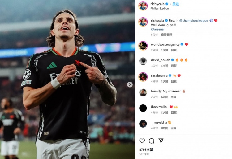 卡拉菲奧里也在賽后通過社媒曬出自己手指隊徽的慶祝照,并紀念道:“我的歐冠首球!伙計們干得漂亮!@阿森納”
