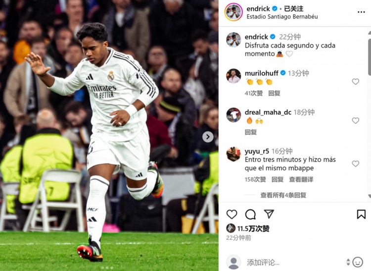 本場(chǎng)比賽恩德里克在最后時(shí)刻替補(bǔ)登場(chǎng),迎來(lái)個(gè)人歐冠淘汰賽首秀。賽后他也在個(gè)人社媒曬出本場(chǎng)照片,配文寫(xiě)道:“享受比賽的每一個(gè)瞬間!”