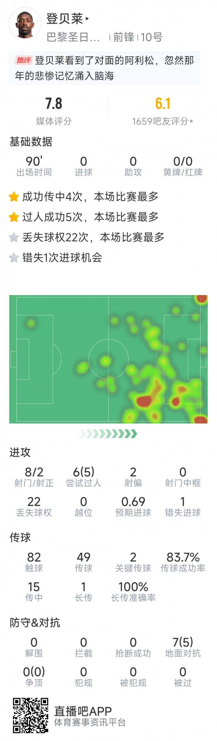 登貝萊本場數(shù)據(jù):8射2正,1次錯失良機,2次關(guān)鍵傳球,5次過人