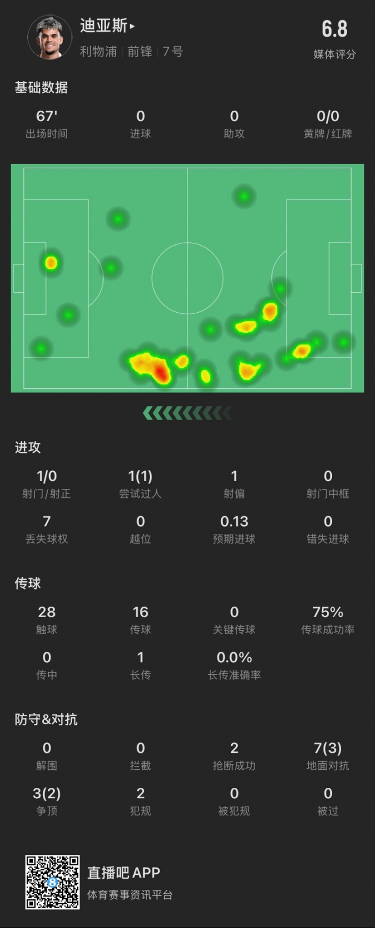 路易斯-迪亞斯本場主要數(shù)據(jù)↓