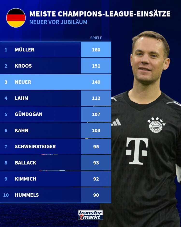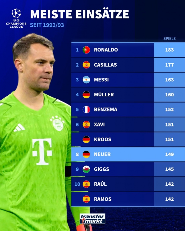 目前,諾伊爾是歐冠出場第三多的德國球員,也在歐冠歷史出場次數榜中排名第8。
