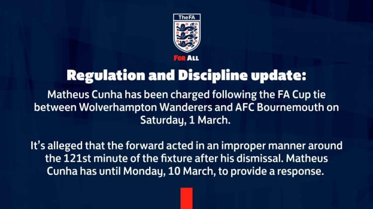 英足總官方表示:“在3月1日足總杯狼隊對陣伯恩茅斯的比賽之后,對庫尼亞提出指控,這位前鋒在被罰下后行為不當,他必須在3月10日周一之前做出回應?!?/p>