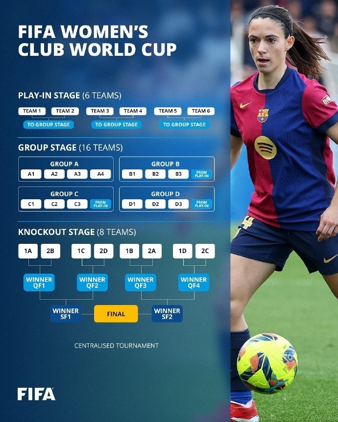 女足世俱杯具體的賽制方面,19個參賽名額分為13個小組賽名額以及6個分組資格賽名額,亞足聯(lián)、非洲足聯(lián)、中北美及加勒比海足聯(lián)和南美足聯(lián)各有兩個小組賽名額,歐足聯(lián)則有五個小組賽名額,分組資格賽名額則六大足聯(lián)各有1個。女足世俱杯分為三個階段,首先是分組資格賽階段(play-in),6支球隊分三組進行單回合淘汰賽,決出3個晉級小組賽的名額。隨后是16支球隊(13支小組賽球隊+3支分組資格賽勝者)組成的小組賽階段,16隊分為四組,每組前兩名球隊晉級淘汰賽。淘汰賽階段有8支球隊參加,采取單回合淘汰賽賽制。