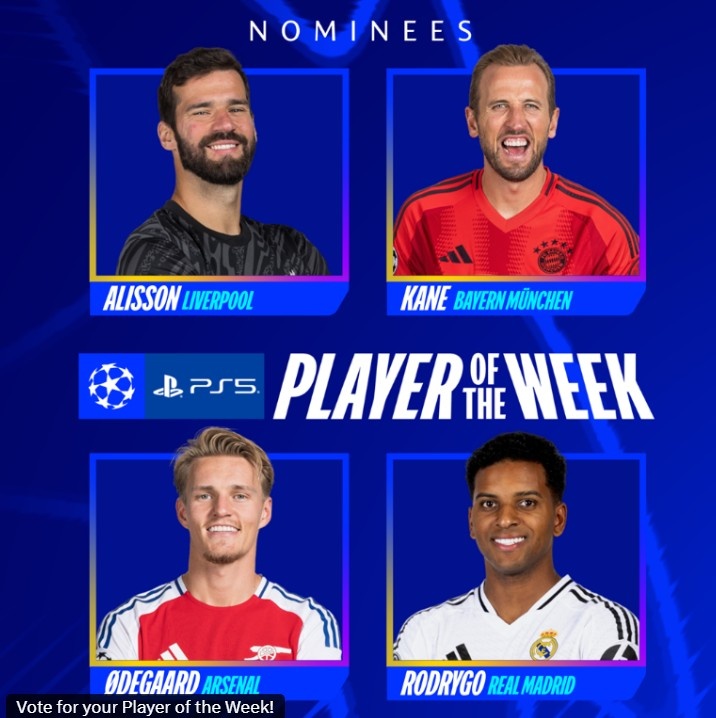 歐冠官方本輪最佳球員候選:阿利森、凱恩、羅德里戈、厄德高