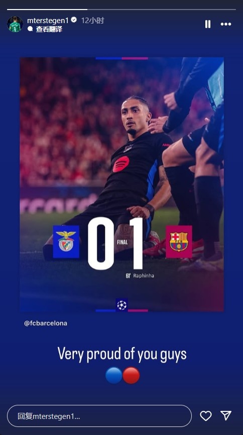 北京時(shí)間周四凌晨,巴薩客場(chǎng)1-0戰(zhàn)勝本菲卡,拉菲尼亞打進(jìn)制勝球。賽后,巴薩門(mén)將特爾施特根在個(gè)人社交媒體上曬出了本場(chǎng)比賽結(jié)果,并配文:“為你們而感到驕傲。”