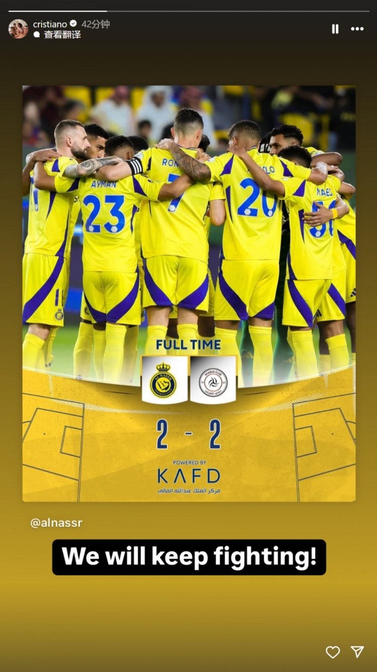 賽后,C羅在個(gè)人社交媒體少出全隊(duì)擁抱的照片,寫道:我們會繼續(xù)戰(zhàn)斗!
