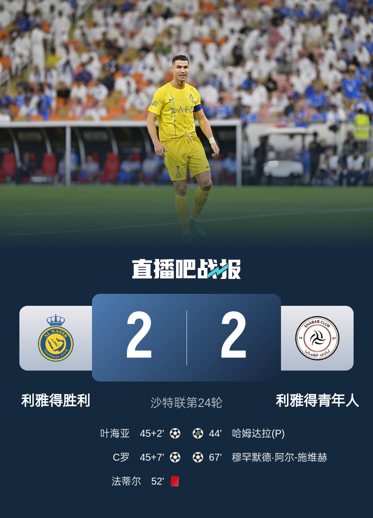 沙特聯(lián)第24輪,十人利雅得勝利2-2利雅得青年人,已落后榜首10分。