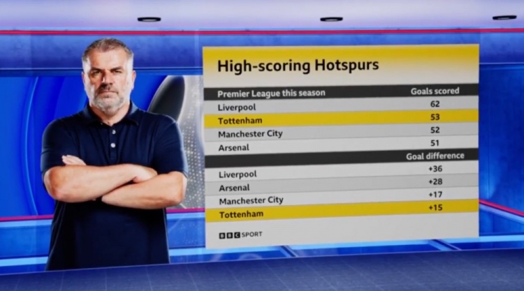 熱刺本賽季英超打進53球僅次利物浦,凈勝球+15排名英超第四